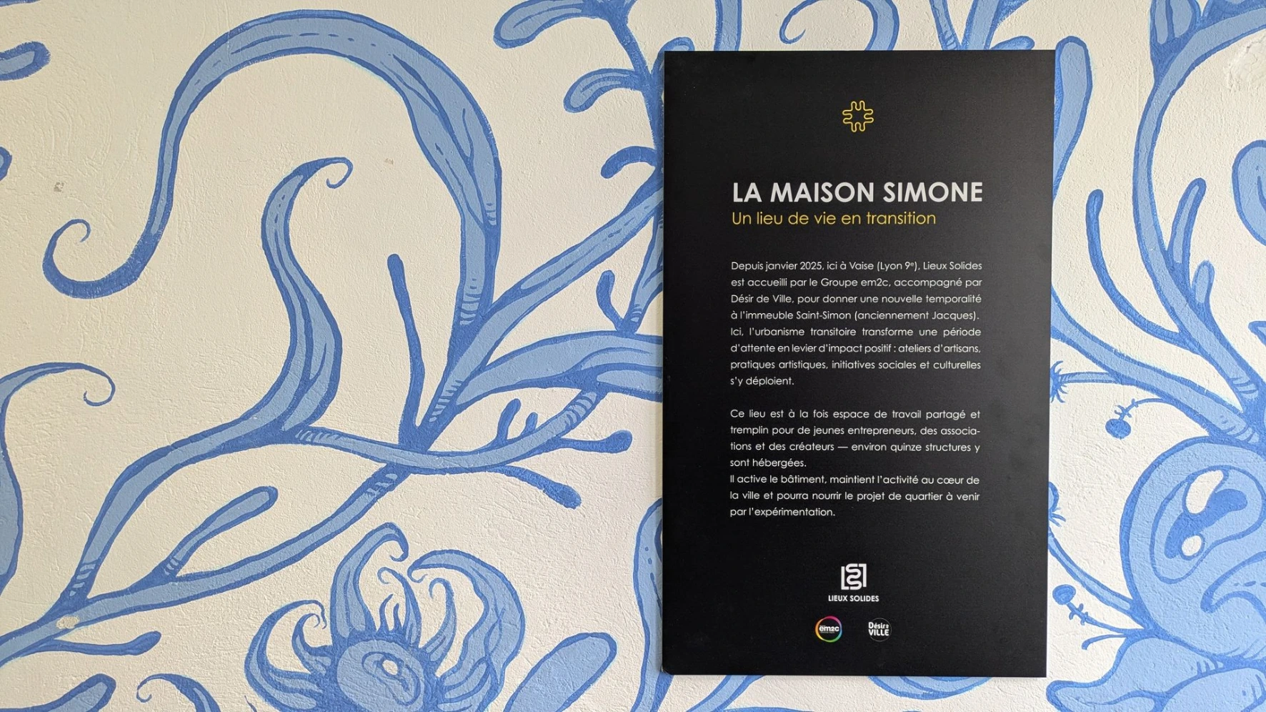 La Maison Simone, une occupation temporaire portée par Lieux Solides à Vaise (Lyon 9e) depuis janvier 2025, incarne notre approche « Gestion d’Écosystème ». Accueilli par le Groupe Em2c accompagné par Désir de Ville, il redonne une temporalité à l’ancien immeuble Jacques sur une durée de 2 années. Par l’urbanisme transitoire, cette période d’attente devient un levier d’impact positif : ateliers d’artisans, pratiques artistiques, initiatives sociales et culturelles s’y déploient. À la fois espace de travail partagé et tremplin pour de jeunes entrepreneurs, un centre de formation pour les femmes du bâtiment, des associations et des créateurs, le lieu héberge aujourd’hui une quinzaine de structures.